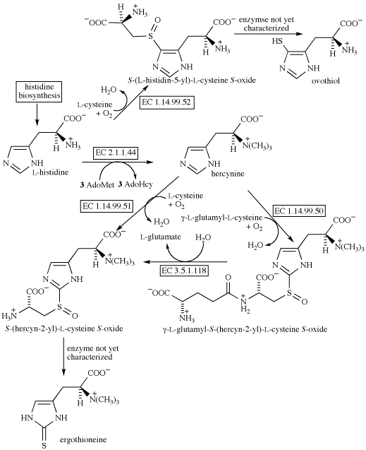 enzymes homepage histidine biosynthesis EC 1.14.99.50 γ-glutamyl hercynylcysteine S-oxide synthase EC 1.14.99.51 hercynylcysteine S-oxide synthase EC 1.14.99.52 L-cysteinyl-L-histidinylsulfoxide synthase EC 2.1.1.44 L-histidine Nα-methyltransferase EC 3.5.1.118 γ-glutamyl hercynylcysteine S-oxide hydrolase
