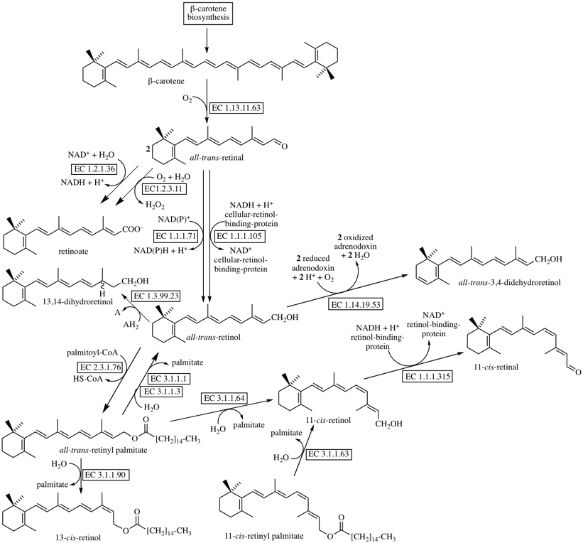 These enzymes act on a range of carotenoids with a β-end group at one end but only giving one molecule of retinal.